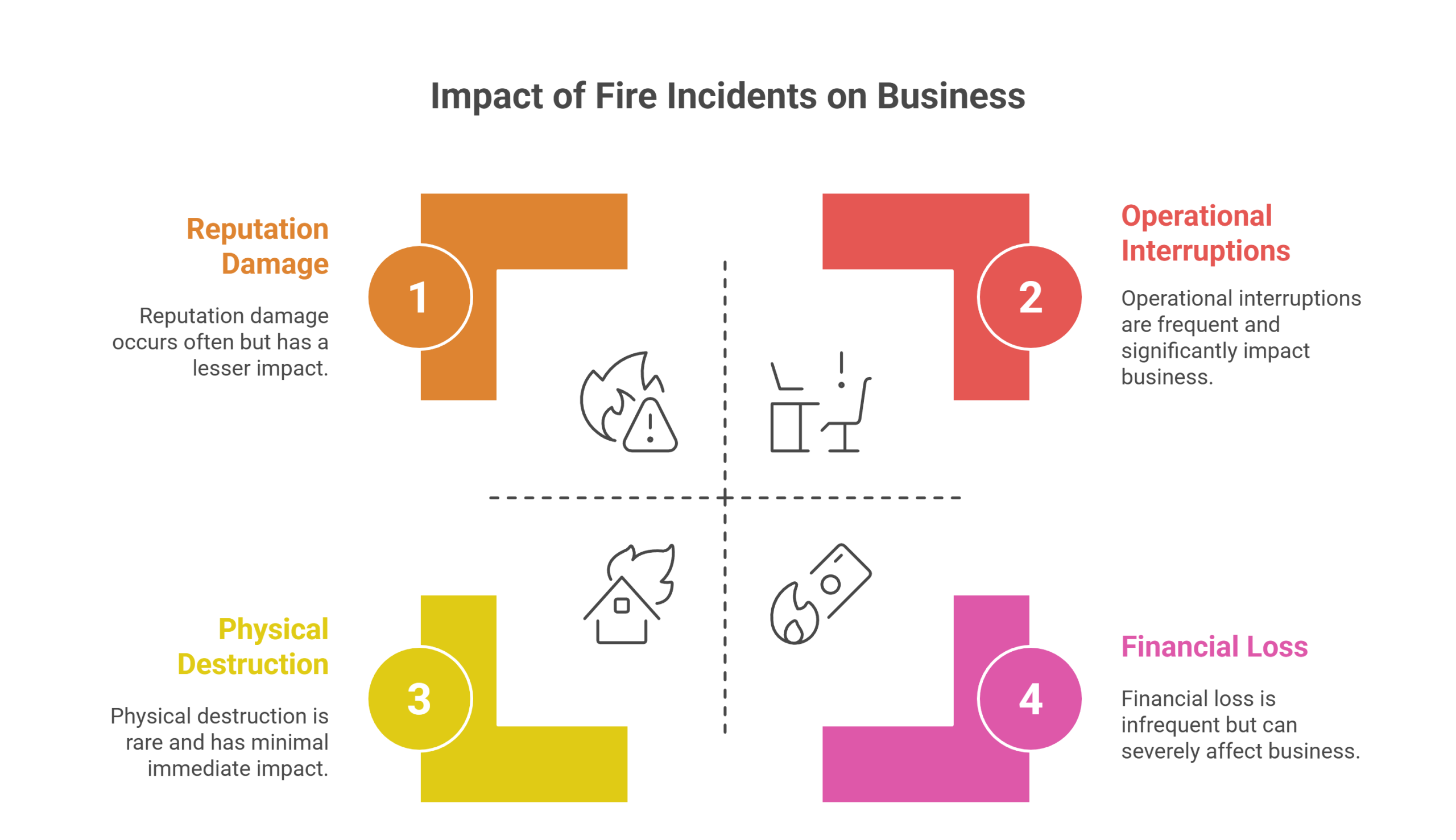 The impact of a fire incident extends beyond just the physical damage caused by the fire. In addition to the physical destruction caused by a fire, operations can be interrupted, a company’s reputation can be negatively affected, and a fire can create a significant financial loss to a company.